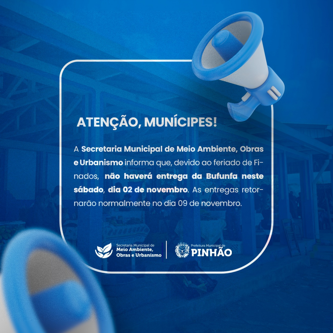 A Secretaria Municipal de Meio Ambiente, Obras e Urbanismo informa que, devido ao feriado de Finados, não haverá entrega da Bufunfa neste sábado, dia 02 de novembro. As entregas retornarão normalmente no dia 09 de novembro.