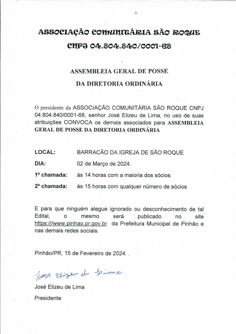 A Associação Comunitária SÃO ROQUE convoca todos os sócios para uma ASSEMBLEIA DE POSSE DA DIRETORIA ORDINÁRIA. Confira as informações abaixo.