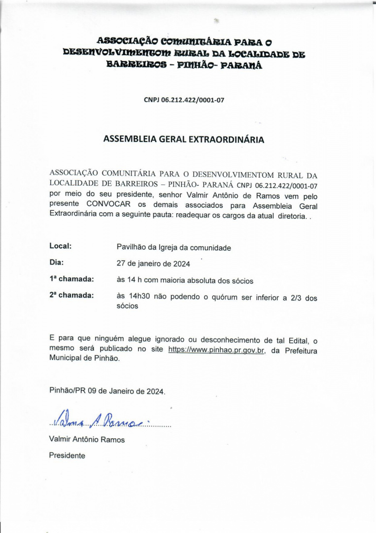 A Associação Comunitária para o Desenvolvimento Rural da localidade de Bairreiros convoca todos os sócios para uma para discutir assuntos importantes relacionados ao desenvolvimento da comunidade na data e local mencionados abaixo. Confira as informações: