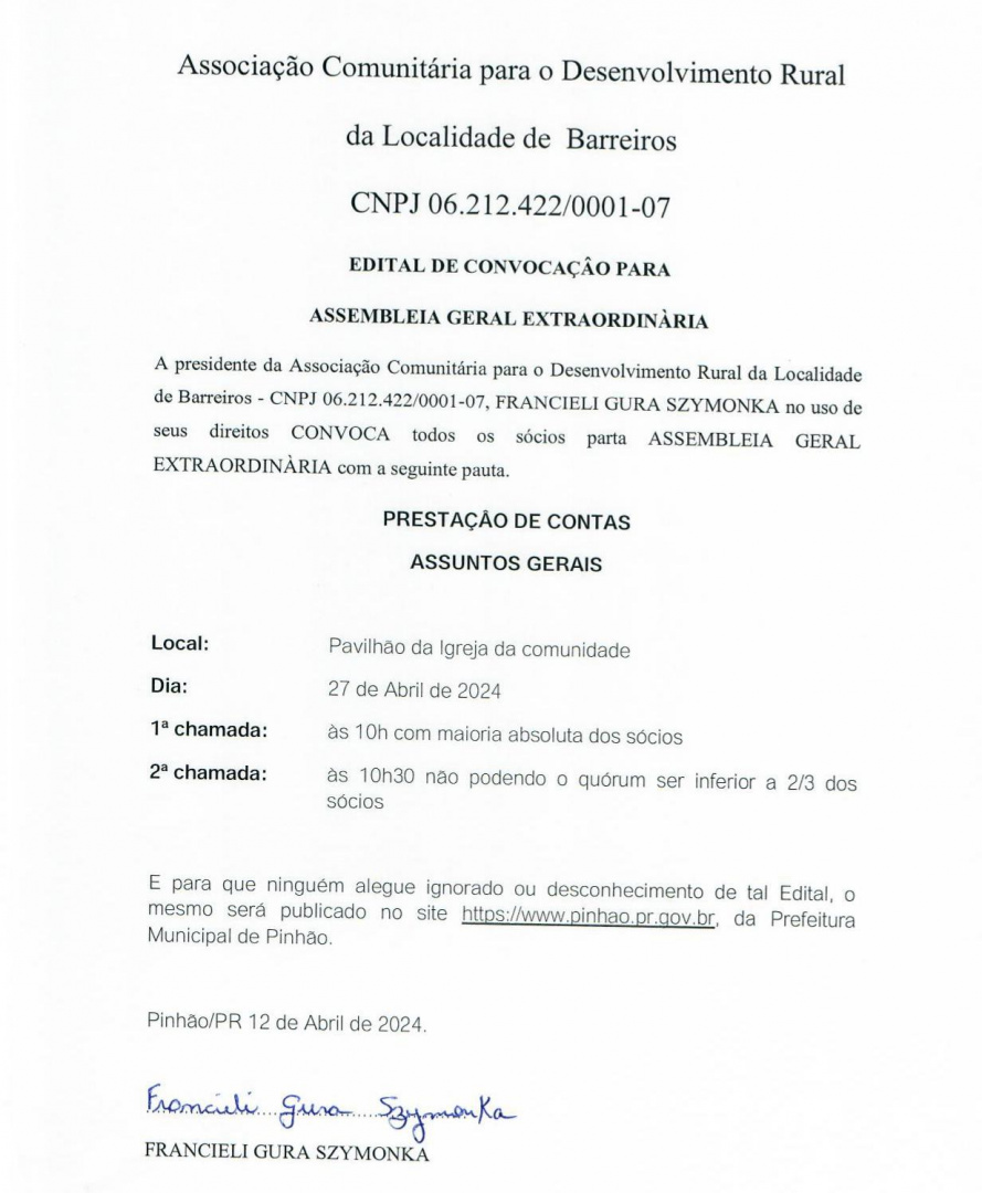A Associação Comunitária para o Desenvolvimento Rural da Comunidade de BARREIROS convoca todos os sócios para uma ASSEMBLEIA GERAL EXTRAORDINÁRIA para prestação de contas e assuntos gerais.