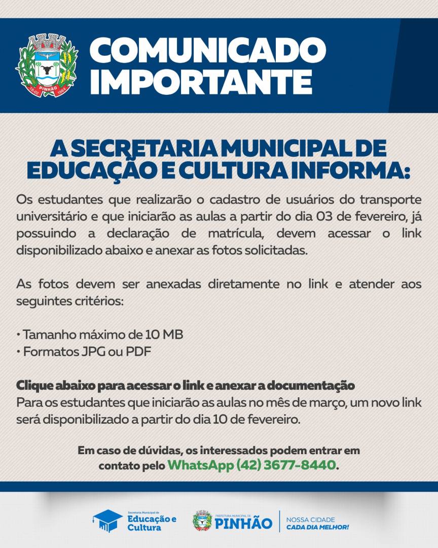 A Secretaria Municipal de Educação e Cultura informa: