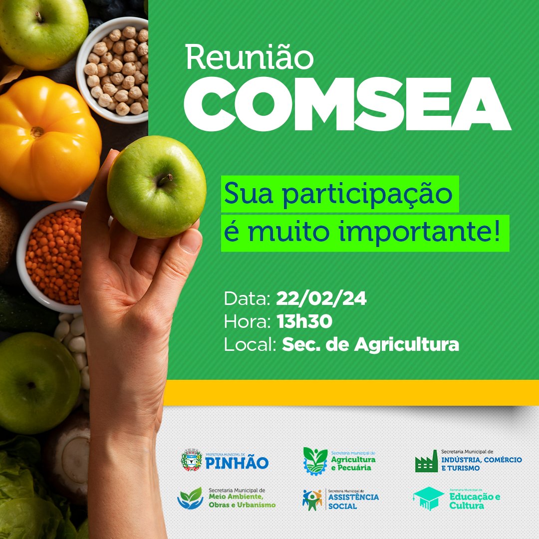 O COMSEA realizará a primeira reunião do ano de 2024 no dia 22 de fevereiro às 13h30 na Secretaria de Agricultura. Participe!